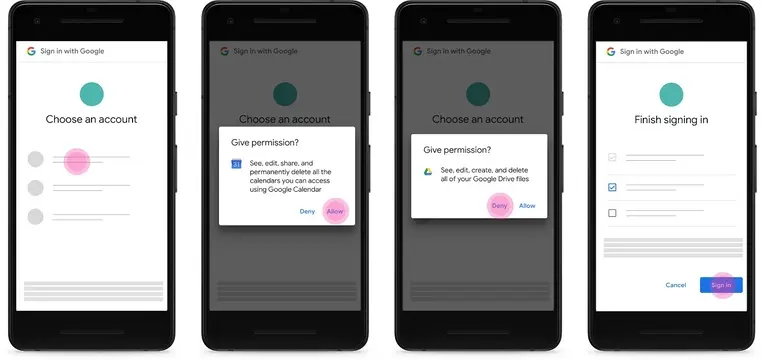 ทาง Google ได้อัปเดตระบบบัญชีสิทธิ์การเข้าถึงซึ่งจะมีการถามทุกครั้งแทนที่จะมีการถามครั้งเดียว เพื่อให้ผู้ใช้สามารถควบคุมแต่ละบัญชีที่ต้องการจะแชร์ข้อมูลในแต่ละแอปได้
