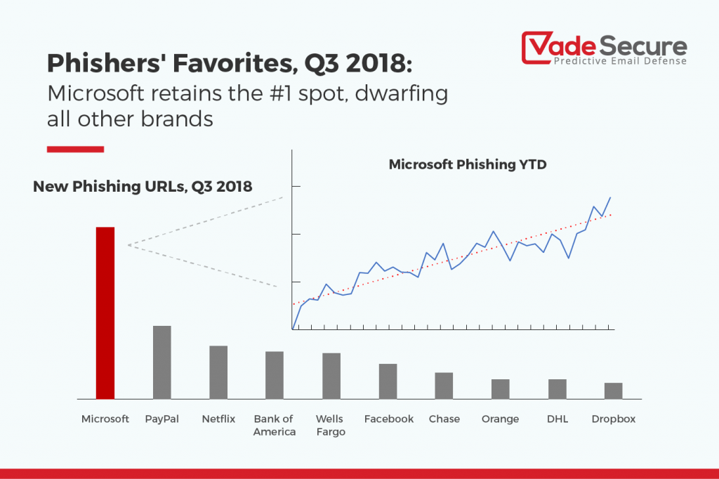 Vade Secure ได้ติดตามการโจมตีแบบฟิชชิ่งกับผู้ให้บริการรายใหญ่ๆ ทั้งหมด 86 ราย พบว่าเป้าหมายหลักของการโจมตีแบบฟิชชิ่งส่วนใหญ่นั้นอยู่ที่บริษัทที่ให้บริการระบบคลาวน์กับบริษัททางการเงิน โดยมี Office 365 ของ Microsoft เป็นเป้าหมายหลักที่โดนโจมตีมากที่สุด