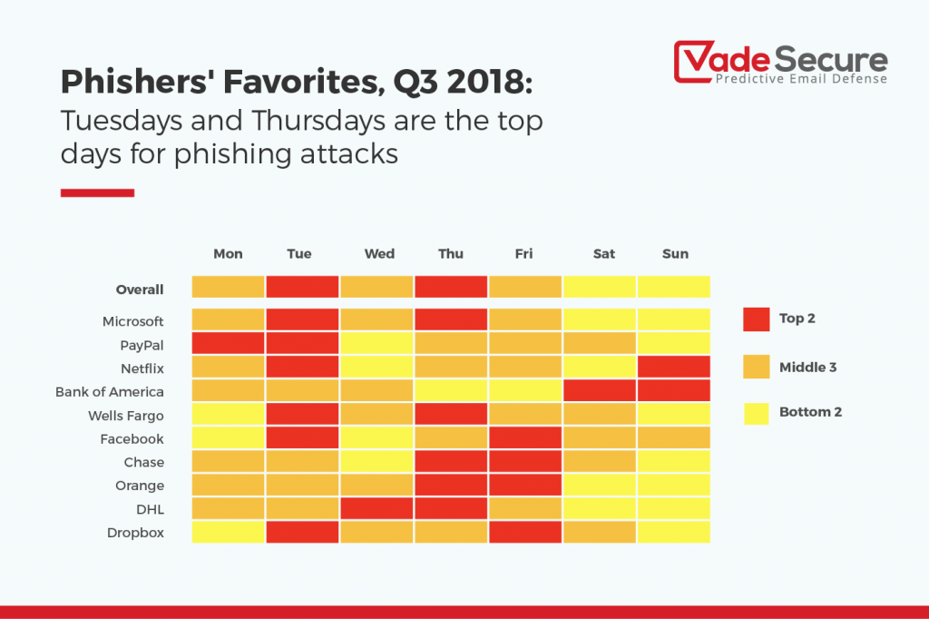 อันดับรองลงมาคือ PayPal และ Netflix ซึ่ง Hacker จะพยายามเข้าถึงข้อมูลบัตรเครดิตของผู้ใช้ รูปแบบของการโจมตีจะขึ้นอยู่กับวัน ซึ่งวันที่มีการโจมตีแบบฟิชชิ่งมากที่สุดคือ วันอังคารและวันพฤหัสบดี ส่วน Netflix วันที่ที่มีการโจมตีมากที่สุด คือวันหยุดสุดสัปดาห์