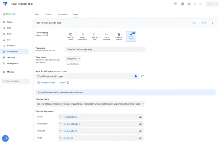 สำหรับผู้ที่ต้องการใช้งาน App Sheet สามารถทำได้โดยไปที่เมนู Automation เลือกสร้าง Bot ใหม่ จากนั้นเลือก Call a script