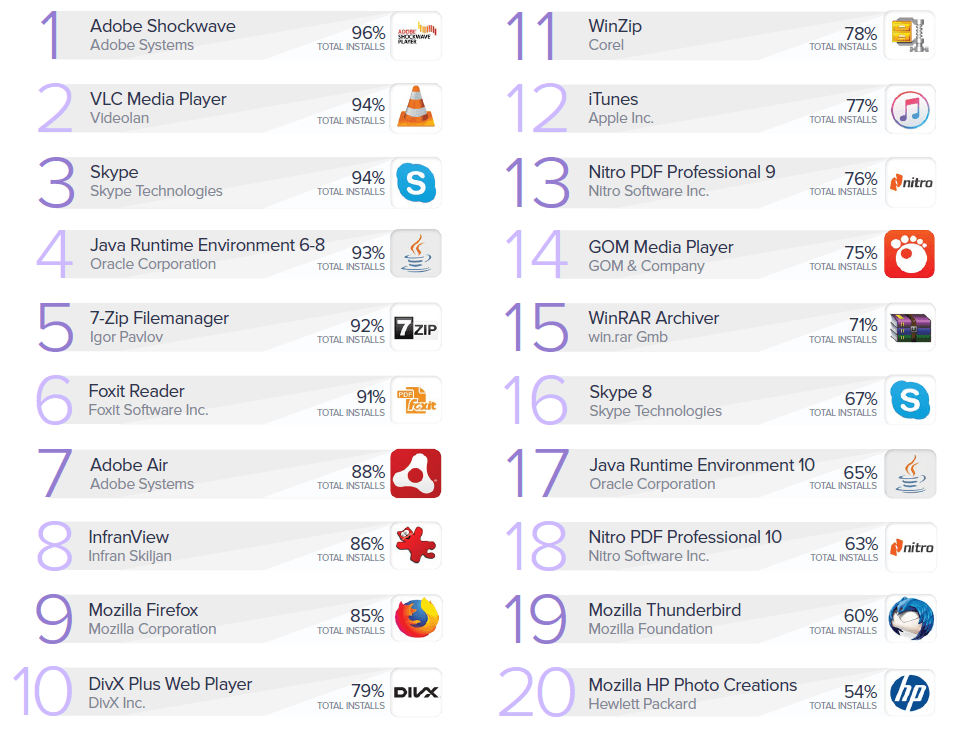 โปรแกรมไม่ได้รับการอัพเดทมากที่สุดคือ Adobe Shockwave, VLC Media Player, และ Skype