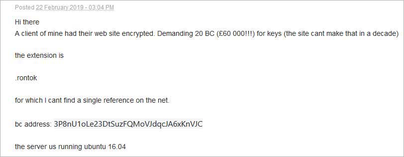 ผู้ใช้รายหนึ่งได้ตั้งกระทู้สอบถามกับทาง BleepingComputer ว่าเว็บของเขาโดนโจมตีด้วย Ransomware “B0r0nt0K” โดยไฟล์ที่อยู่บนเซิร์ฟเวอร์ที่เขาใช้ทั้งหมดถูกเข้ารหัสด้วยไฟล์ที่มีนามสกุล “.rontok” ซึ่งระบบปฏิบัติการที่เข้าใช้บนเซิร์ฟเวอร์คือ Ubuntu 16.04 ดังภาพ