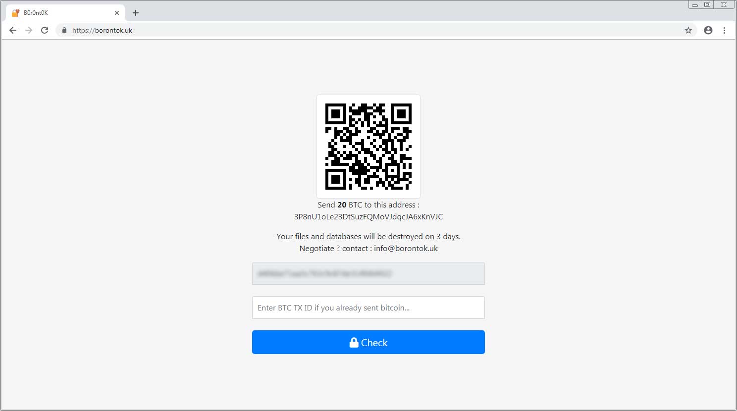 เมื่อใส่ ID แล้วจะเข้าสู่หน้าการชำระเงิน แฮกเกอร์จะให้ชำระเงินค่าไถ่เป็นเงิน 20 bitcoin หรือเท่ากับ 75,000 เหรียญ คิดเป็นเงินไทยประมาณ 2,348,737.50 บาท ซึ่งแฮกเกอร์ได้ให้ที่อยู่ในการส่งค่าไถ่มาด้วย แต่อย่างไรหากเหยื่อต้องการเจรจาต่อรองสามารถทำได้ โดยอีเมลไปที่ info@botontok.uk ดังภาพ