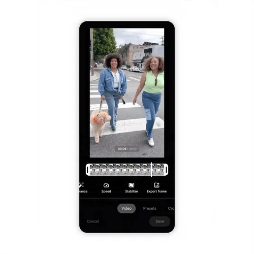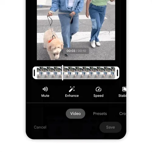 Google Photos ได้วางเครื่องมือสำหรับแก้ไขวิดีโอ เช่น Mute, Enhance, Speed, Stabilize และ Export frame ไว้ที่ด้านหน้าและตรงกลางของแท็บ Video รวมไปถึงยังมีเครื่องมือสำหรับตัดฟุตเทจจากวิดีโอที่ต้องการได้อย่างแม่นยำ