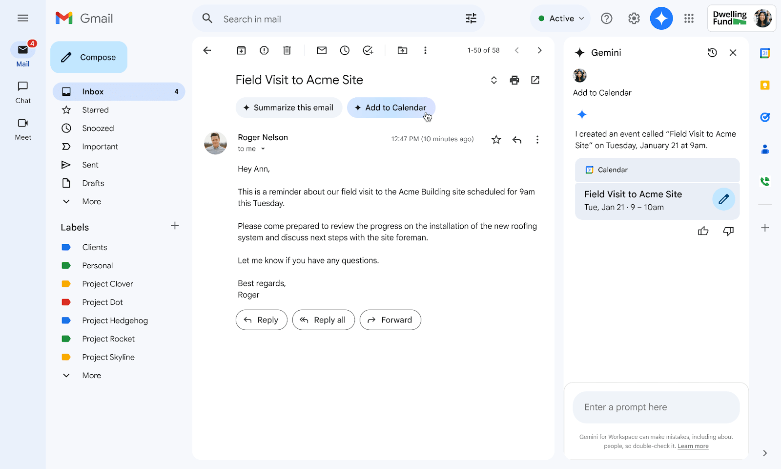 ขณะนี้ Gemini ใน Gmail ได้มีอัปเดตให้สามารถเพิ่มกิจกรรมไปยัง Calendar ได้อย่างรวดเร็ว ซึ่งมีความคล้ายคลึงกับฟีเจอร์ในอดีตของ Google ที่ไม่ได้ใช้ AI อย่างฟีเจอร์ในการเพิ่มหรืออัปเดตกิจกรรมใน Calendar โดยอัตโนมัติตามการนัดหมายหรืออีเมลการเดินทาง