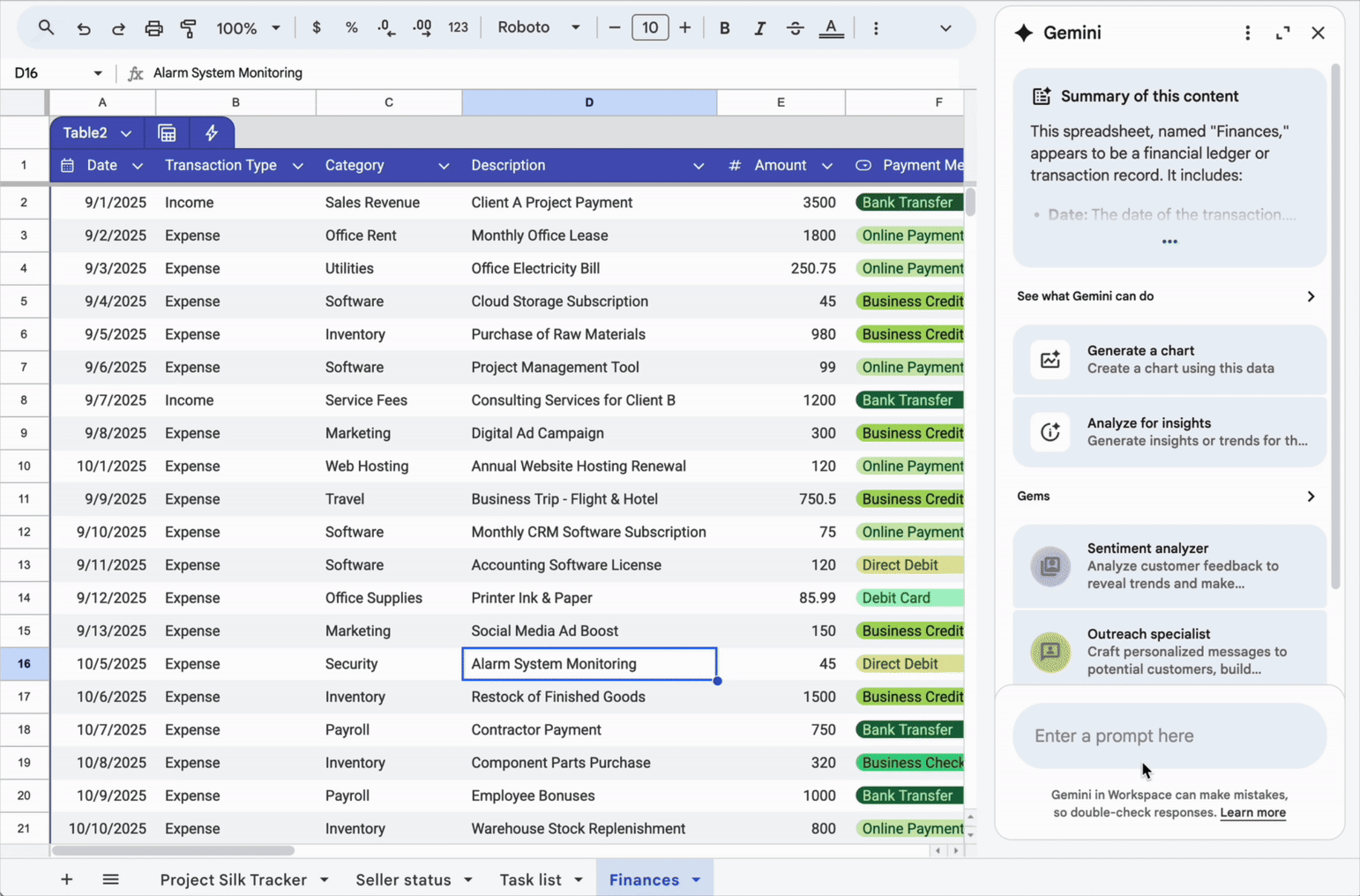 Gemini สามารถเข้าใจคำสั่งที่ซับซ้อน เช่น “ช่วยจัดรูปแบบตารางโครงการนี้ใหม่ เพิ่มคอลัมน์ ‘Days Until Due Date’ ใส่ช่องติ๊ก ‘Completed’ และตรึงแถวหัวตารางไว้ด้วย” โดยระบบจะทำทุกอย่างให้พร้อมในครั้งเดียว ตั้งแต่การเพิ่มสูตร คอลัมน์ และการจัดรูปแบบ โดยไม่ต้องแยกพิมพ์คำสั่งหลายรอบ
