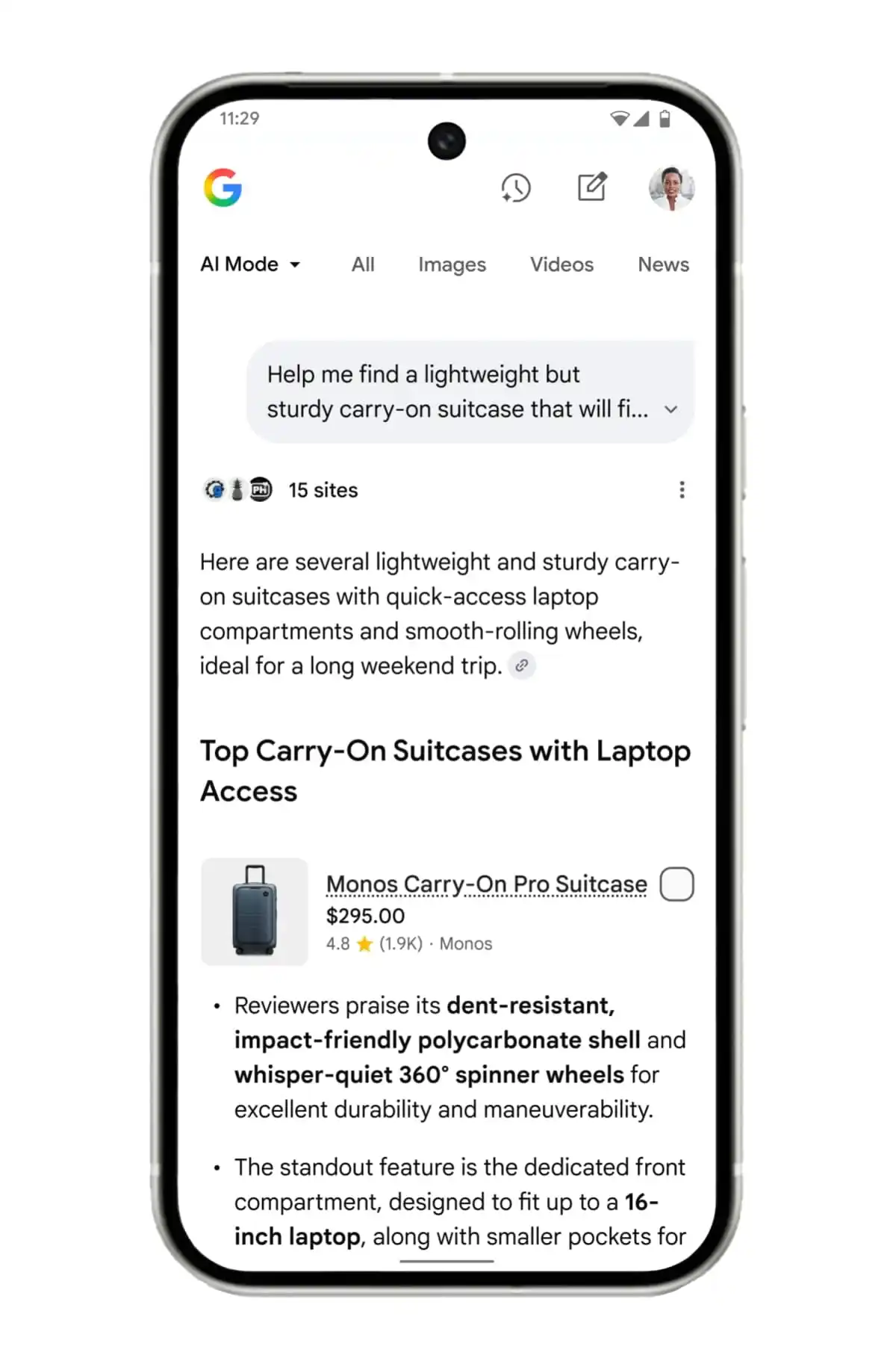 นอกจากนี้ อีกหนึ่งไฮไลต์สำคัญคือ Business Agent เมื่อผู้ใช้ค้นหาร้านค้าหรือแบรนด์ที่รองรับ ก็จะเห็นปุ่ม Chat ปรากฏในผลการค้นหา โดย AI ตัวนี้จะทำหน้าที่เสมือนพนักงานขายออนไลน์ เช่น ตอบคำถามเกี่ยวกับสินค้า แนะนำรุ่นหรือโปรโมชันที่เหมาะกับผู้ใช้ ช่วยปิดการขายและพาไปจ่ายเงินทันที ชึ่งถือเป็นการผสาน Search + Chat + Commerce ไว้ในจุดเดียว